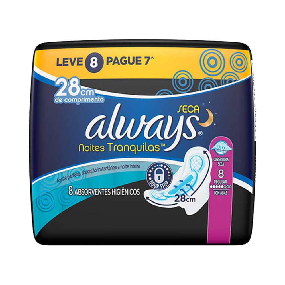 Absorvente noturno Always Noites Tranquilas com 28 cm e camada superior seca, desenvolvido para proteger e dar conforto durante toda a noite. Possui tecnologia Odor Stop que neutraliza odores e abas laterais para melhor fixação. Embalagem econômica Leve 8 Pague 7 para mais proteção com custo-benefício.