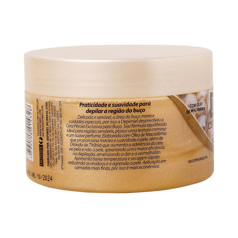 Cera depilatória Pérola Depimiel especialmente formulada para a região do buço. Com óleo de macadâmia e dióxido de titânio, oferece alta aderência e hidratação, removendo os pelos com suavidade e menor irritação. Textura cremosa para aplicação prática e resultado uniforme.