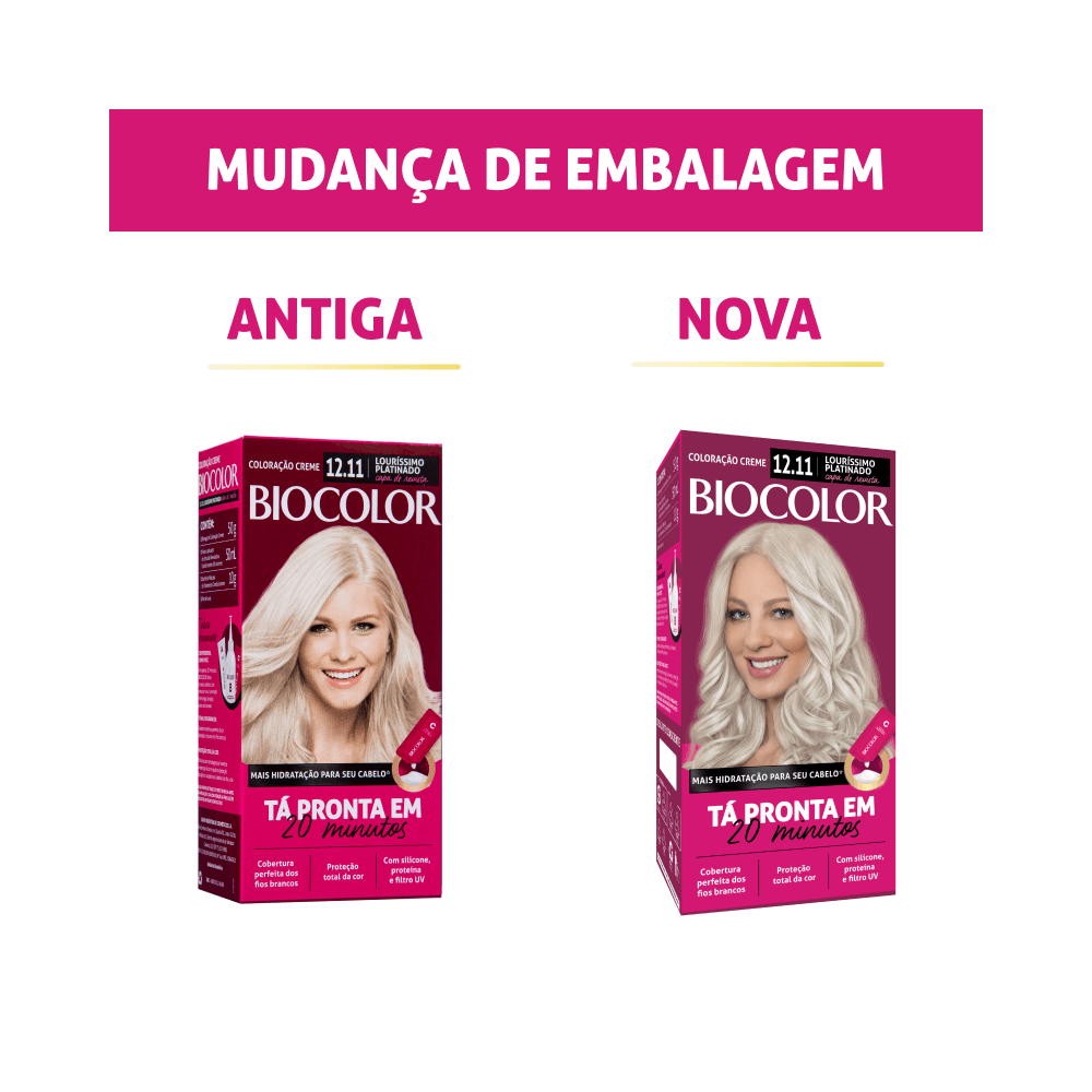 Coloração Biocolor 12.11 traz tom platinado luminoso com cobertura completa dos fios brancos em apenas 20 minutos. Fórmula com silicone, proteína e filtro UV hidrata e protege a cor, deixando os fios macios, perfumados e com resultado profissional no conforto de casa.