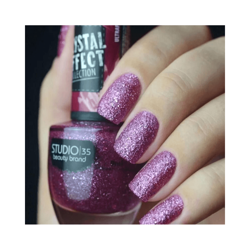 Esmalte roxo Studio 35 com acabamento cristalino e brilho intenso. Fórmula de secagem rápida e alta durabilidade, com pincel largo que proporciona aplicação uniforme e cobertura profissional em poucas camadas. Ideal para unhas sofisticadas com efeito refletivo e partículas de brilho que realçam a cor.