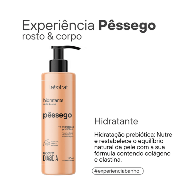 Fragrância pêssego e textura leve: hidratação imediata com toque aveludado e rápida absorção.
