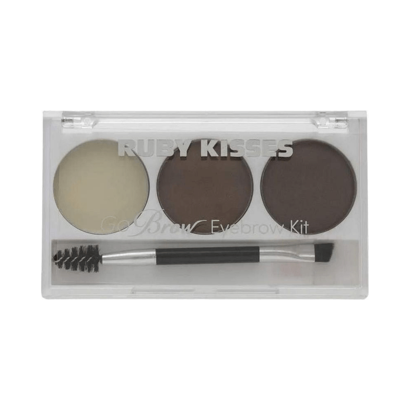 Kit completo para sobrancelhas RK By Kiss Black Dark: estojo compacto com três tonalidades, cera modeladora, pincel duplo e espelho integrado. Proporciona preenchimento preciso, fixação prolongada e acabamento natural ou definido, ideal para retoques rápidos e resultado profissional.