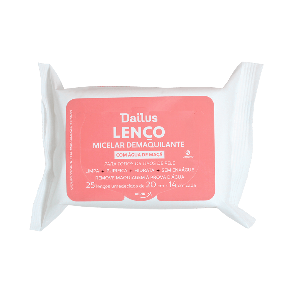 Lenços micelares Dailus que removem maquiagem, inclusive à prova d'água, com água de maçã para controlar oleosidade e hidratar. Práticos e dermatologicamente testados, ideais para limpeza rápida e suave do rosto, olhos e lábios sem necessidade de enxágue.