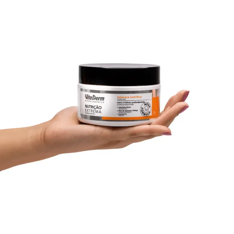 Máscara nutritiva Vita Derm que proporciona nutrição intensa e hidratação profunda para cabelos danificados e ressecados. Com ácido hialurônico, nanoproteína e óleos naturais, recupera a maciez, fortalece os fios e devolve brilho saudável sem pesar.