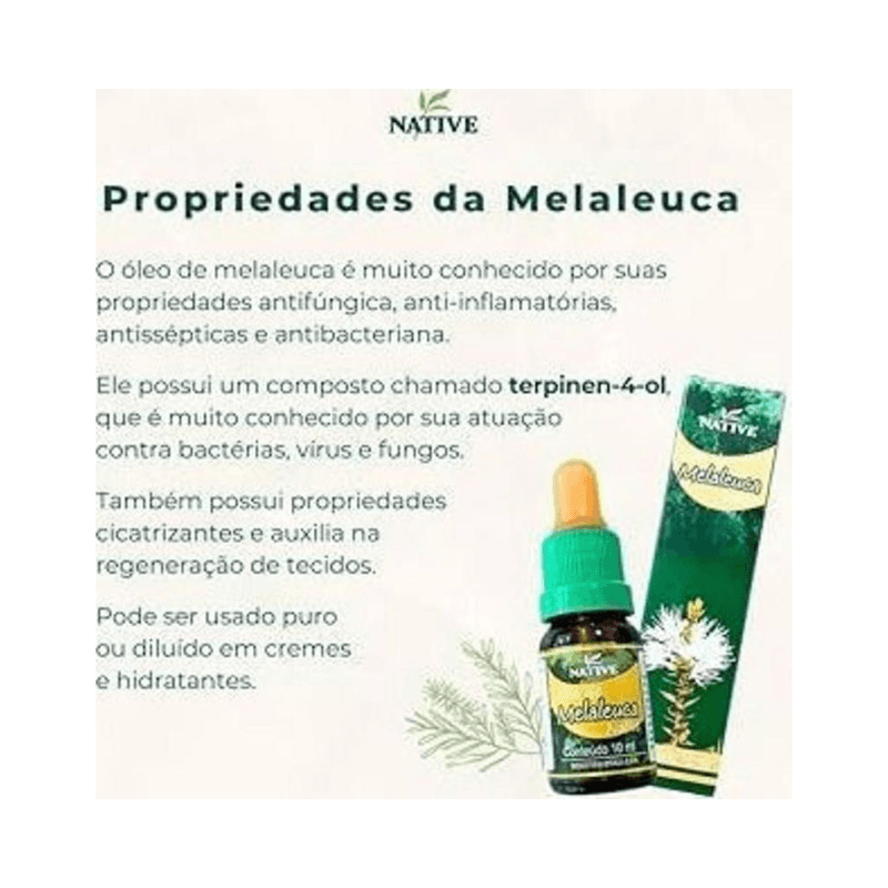 Óleo essencial 100% puro de Melaleuca Native em frasco âmbar com conta-gotas. Com ação antibacteriana e aroma fresco amadeirado, auxilia no cuidado da pele e couro cabeludo, contribuindo para controle de acne e caspa. Versátil para uso tópico e aromaterapia, ideal para integrar sua rotina de bem-estar.