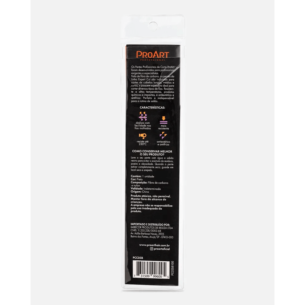 Pente profissional ProArt em fibra de carbono e nylon: resistência ao calor, ação antiestática e design ergonômico para cortes precisos e acabamento sem frizz. Ideal para uso em salões e barbearias, proporciona controle e durabilidade no dia a dia.