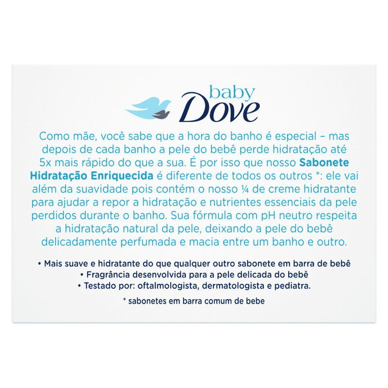 O Sabonete Dove Baby Hidratação Enriquecida é formulado especialmente para cuidar da pele delicada do bebê, proporcionando uma limpeza suave e eficaz. Com 1/4 de creme hidratante, ele ajuda a repor a hidratação e os nutrientes essenciais perdidos durante o banho, mantendo a pele macia e protegida. Sua fórmula hipoalergênica e de pH neutro é testada por dermatologistas, oftalmologistas e pediatras, garantindo segurança e conforto para o uso diário. Além disso, deixa um perfume suave e delicado, ideal para o cuidado especial que o bebê merece.