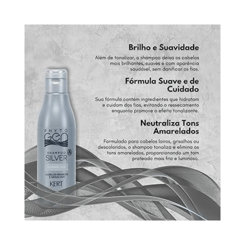 Shampoo desamarelador Phytogen Silver 250ml que neutraliza tons amarelados em cabelos brancos, loiros e descoloridos. Com pigmentos violetas e pH balanceado, hidrata sem ressecar, devolvendo brilho frio e maciez. Ideal para manutenção regular da cor.