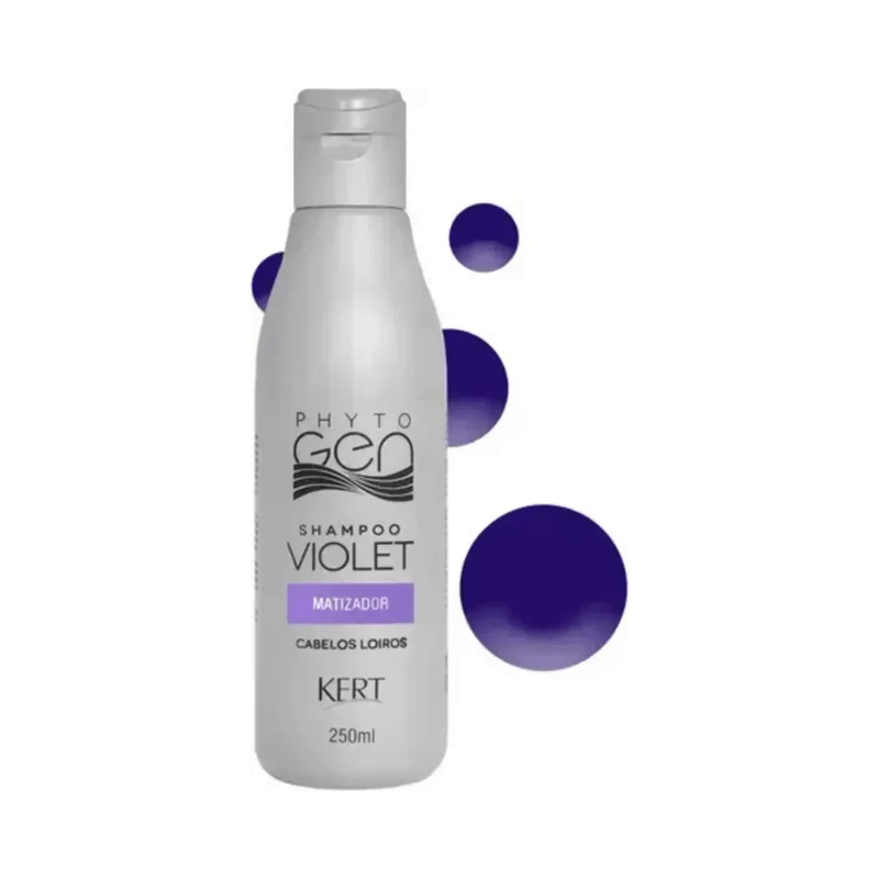 Shampoo tonalizante Phytogen Violet da Kert neutraliza tons amarelados de cabelos loiros e descoloridos com pigmentos violetas, oferecendo neutralização efetiva, brilho intenso e cuidado sem ressecar. Resultado visível já na primeira aplicação e uso prático com embalagem flip-top.