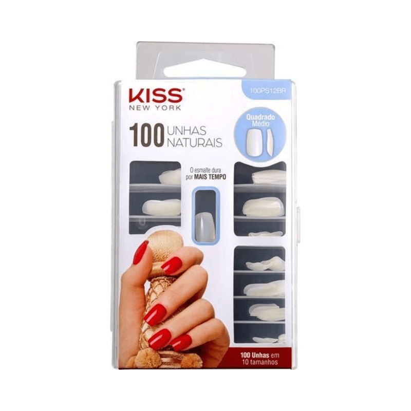 Unhas postiças Kiss New York que entregam acabamento natural e sofisticado com praticidade. Pacote com 100 unidades em 10 tamanhos para ajuste perfeito, formato quadrado médio e material resistente para maior durabilidade. Compatível com colas comuns e ideal para personalizar com esmalte ou nail art.